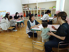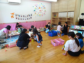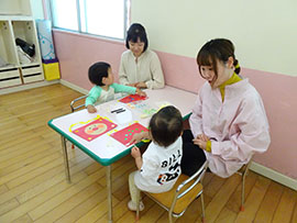 | ママに抱っこしてもらって嬉しそう♥ | お部屋の遊びはお友だちとの 出会いの場です |