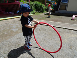 | 園庭開放もしています | フラフープに興味深々 | |